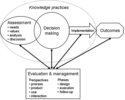One important part of the open decision making practice is a web-workspace to share knowledge and learn from others. In the web-workspace both scientific knowledge and policy alternatives and objectives are systematically represented. The workspace does not replace the actual decision making and its processes. Instead, it improves the processes of decision support by offering practices and tools ----#: . tai ehkä pikemminkin tarjoaa työkaluja, jotka edesauttavat uudenlaisten käytäntöjen syntymistä. --Mikko Pohjola 18:08, 23 September 2013 (EEST) (type: truth; paradigms: science: comment) to describe any decision-related information that is relevant in the eyes of a decision maker, stakeholder, or researcher. It does not attempt to replace current activities such as TV discussions, negotiations, or committee meetings, but to facilitate information use in them. A main advantage is that specific rules improving information (such as scientific criticism) can be applied within the workspace even if they cannot be applied in other policy forums.