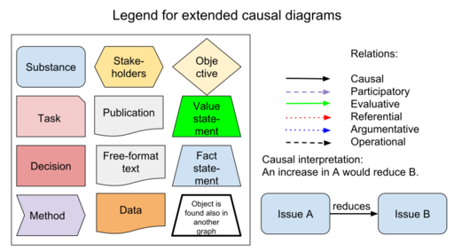 These diagrams use graph theory with vertices (or nodes) and arcs (or arrows). They are used to describe and define all the pieces needed for a description of the situation under scrutiny. Diagrams may be produced with any graphics software, providing that calculation functions are not required. If calculations are needed, we recommend the use of R software and OpasnetUtils package.